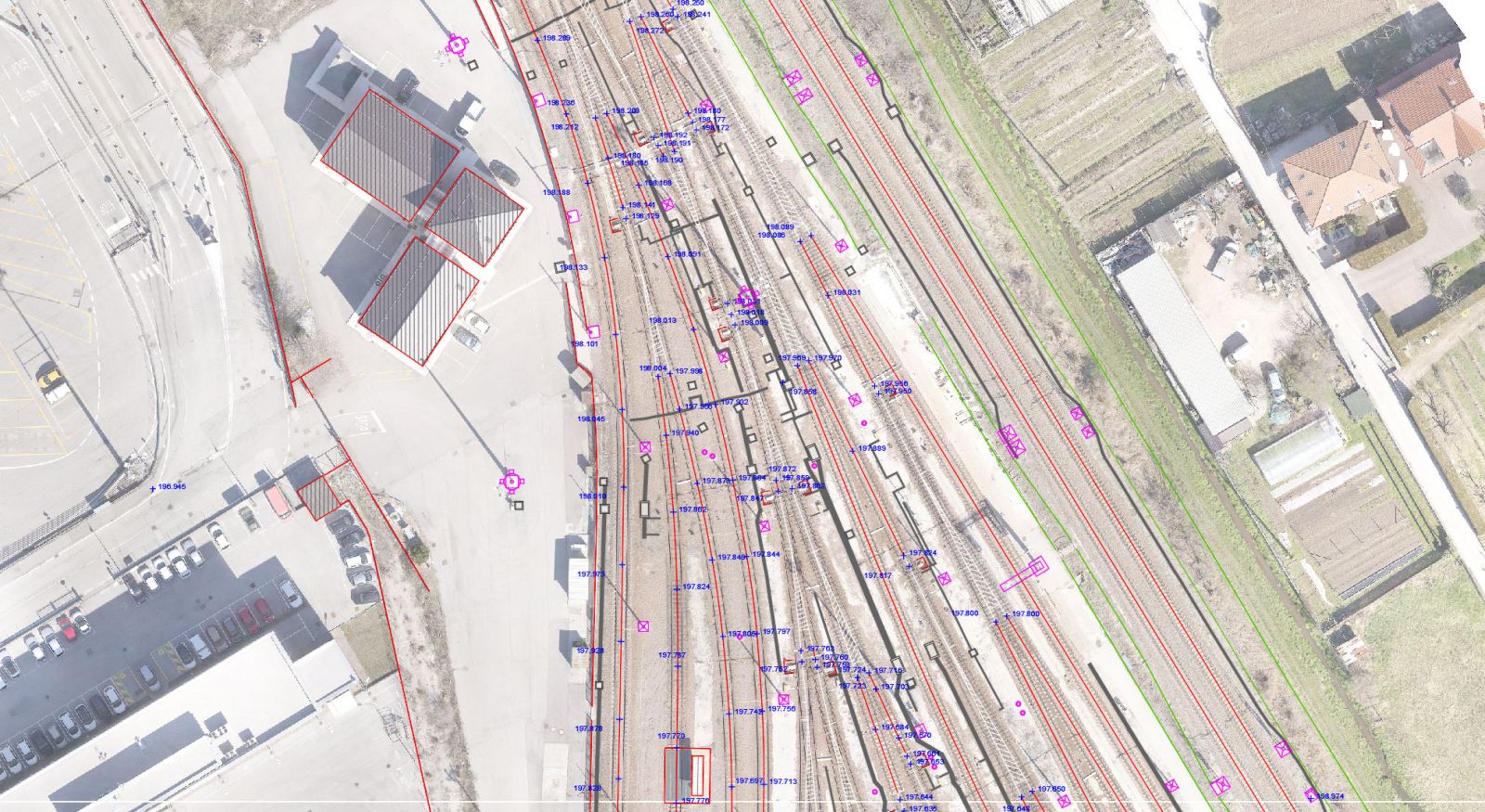Rilievo areale interporto ferroviarioi di Roncafort (TN), rilievo integrato aero-fotogrammetrico ad altissima risoluzione (1cm x pixel) con rilievo topografico terrestre. Il rilevo è stato eseguito in DIP, sistema di coordinate UTM e rettilinee.